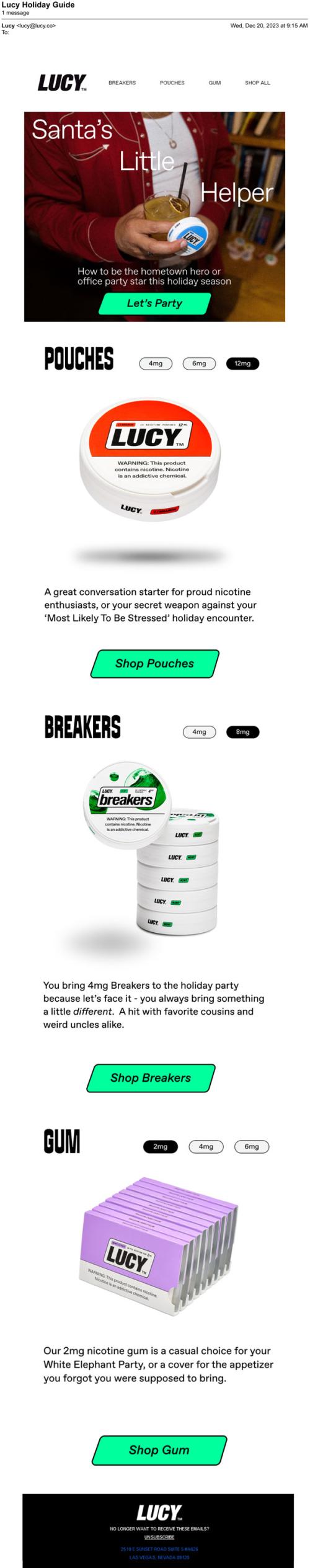 Email from Lucy in December 2023 with ideas to use their various products to make holiday parties better.