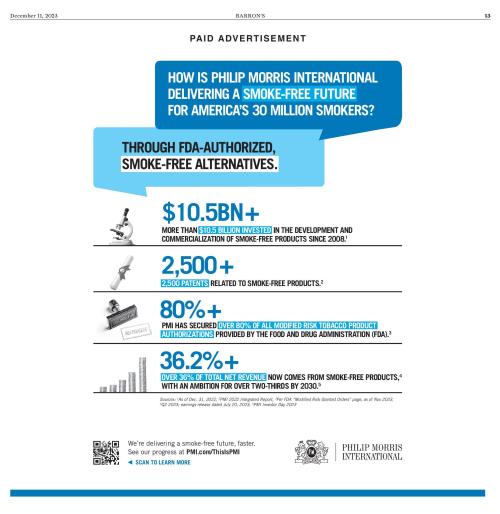 Ad by Philip Morris International that describes how the company is working towards a "smoke-free future," with an emphasis on their MRTP authorizations and investments in smoke-free product development.
