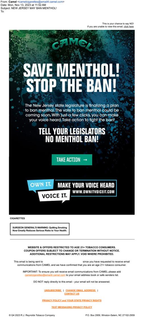 will ban menthol cigarettes in New Jersey. Encourages the recipient to go to "Own it.
