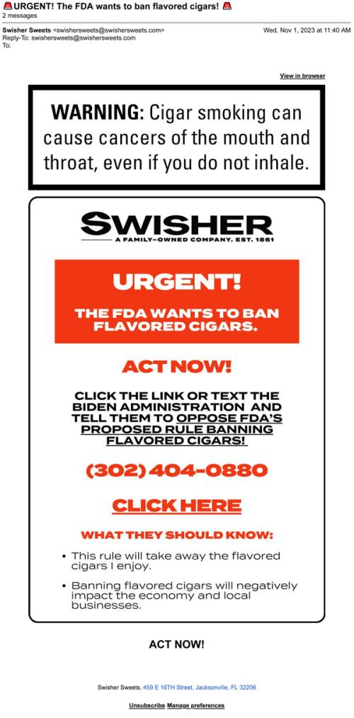 Email from Swisher in November 2023 urging recipients to text or email the Biden administration to oppose the FDA's proposal to ban flavored cigars. Includes some talking points to bring up like economic impact and smoker enjoyment.