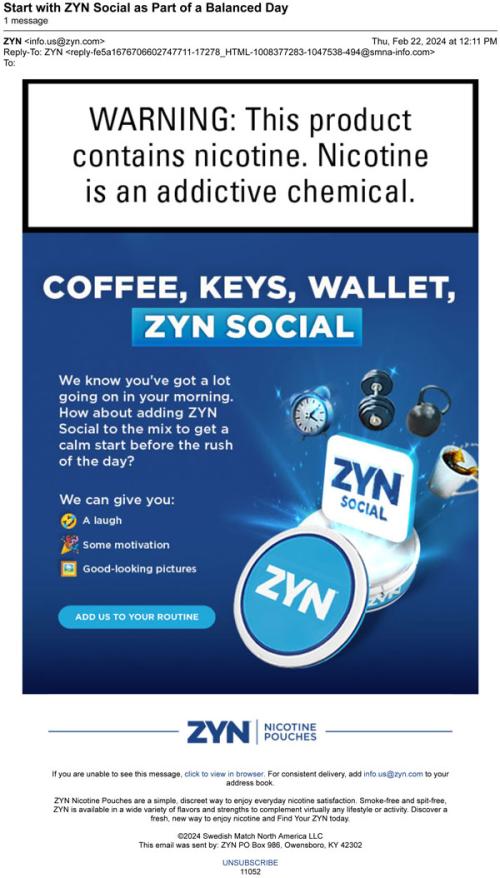 Email from ZYN in February 2024 promoting their official Instagram account and encouraging the recipient to make spending time on the account part of a regular routine.