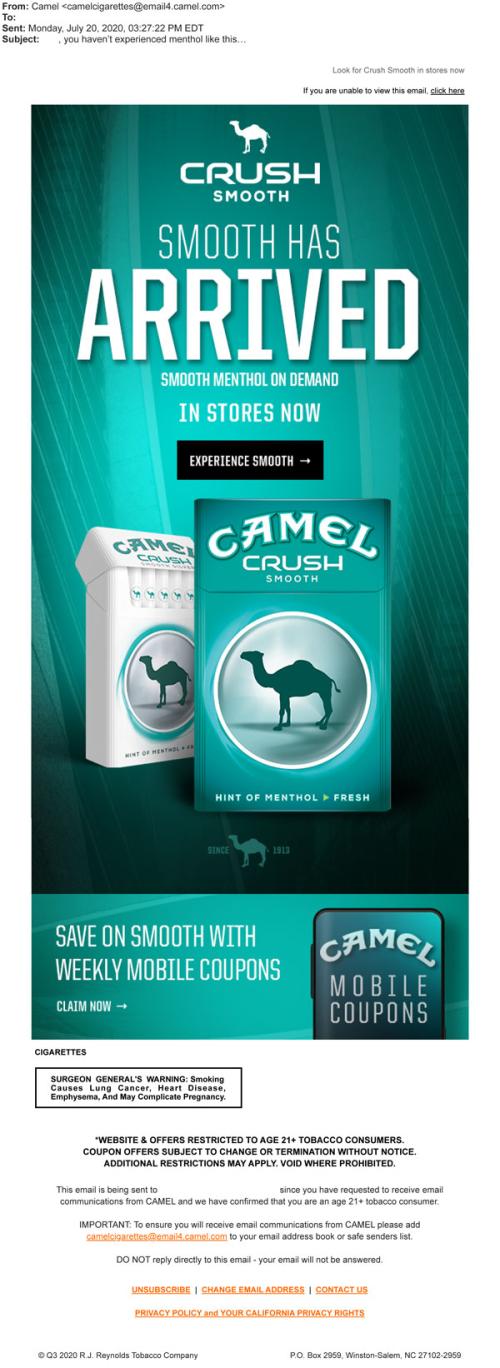 Email in July 2020 promoting the arrival of Camel Crush Smooth Menthol cigarettes in stores. Links to the brand website to learn more. Also promotes the availability of weekly mobile coupons.