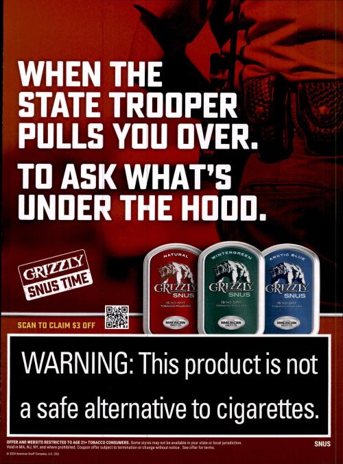 Magazine ad promoting Grizzly Snus, with a QR code to scan and claim coupons.