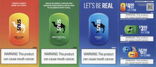 Direct mail from Camel Snus received in May 2025 celebrating "what's real." The mailing displays the varieties of snus the brand offers in colorful cans, and includes coupons. Product imagery is included on the envelope.