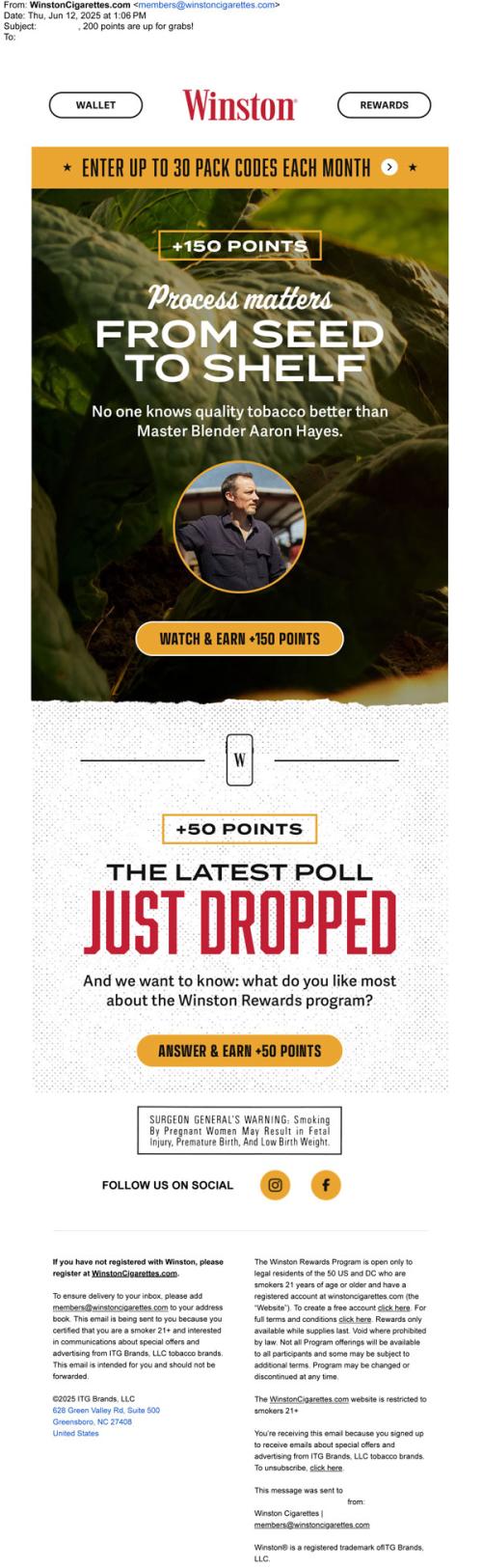 Email from Winston in June 2025 promoting ways to earn rewards points for their Rewards program, like watching a video on the brand website, answering a poll, and entering pack code. The email also links to the brand's social media pages for the Rewards program.