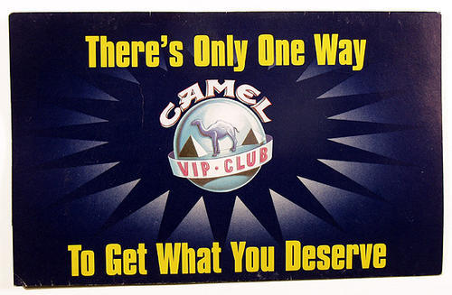 Pamphlet offer to join the "Camel VIP Club". Front says "There's only one way to get what you deserve" inside reads "Join the club." Pamphlet is blue.
