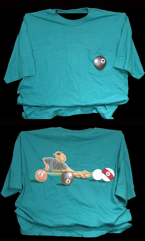 XL Turquoise Camel t-shirt with Camel character playing billiards on the back.