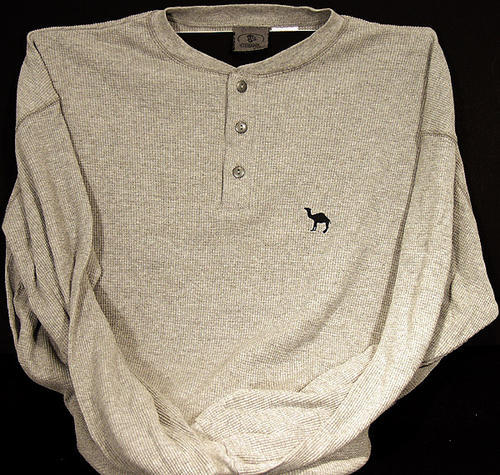Tan, long sleeve thermal shirt; Camel embroidered on chest in black.