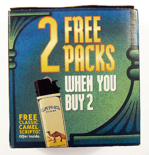 Camel filters: "2 free packs when you buy 2. Get a free classic Camel scripto offer inside." Blue and green box, image of lighter on side and back of the box.
