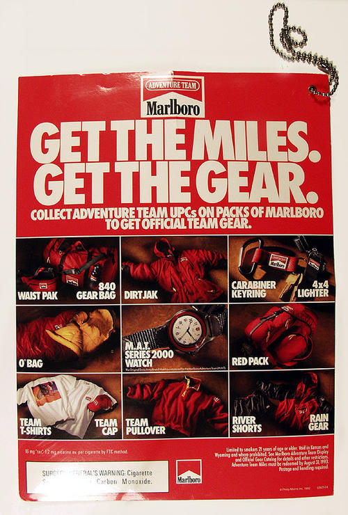 "Get the miles, get the gear" Red poster. Pictures of gear for the Marlboro Adventure Team.