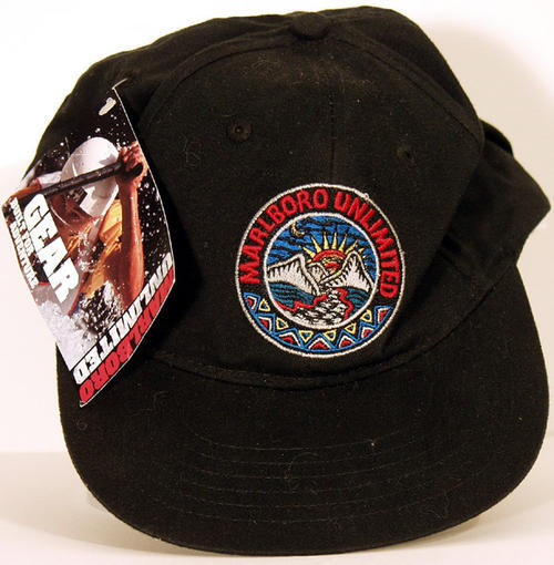 Marlboro Unlimited Gear: Black cap, unfitted with circular logo on front picturing sun rising in the horizon with red text saying "Marlboro Unlimited".