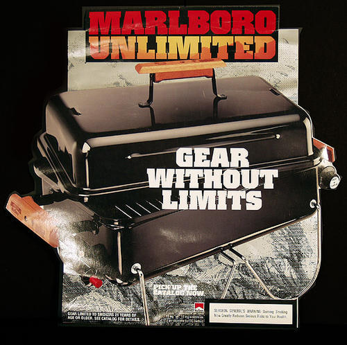 "Marlboro Fear Without Limits" Posterboard of a Bar B Q. "Marlboro Unlimited" in red and orange.