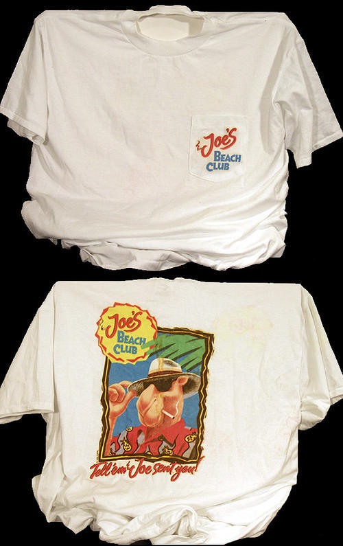 White T-shirt. "Joe's Beach Club" on front left pocket. Back says "Joe's Beach Club - tell em Joe sent you" with a picture of Joe Camel in a hat and Hawaiian shirt.