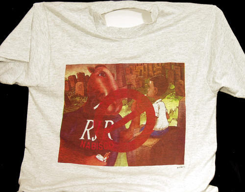 Gray T-shirt. Scene on front is of Joe Camel lighting a little boy's cigarette in a cemetary with a big cross out over the scene. Joe Camel is wearing a T-shirt that says "RJR Nabisco".