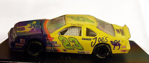 Camel toy racing car, yellow and purple. "Camel Powered", "Smokin' Joe's". Jimmy Spencer car #23 Nascar replica.