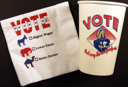 Party favors for Camel. Election year. Paper napkins "vote" with Donkey next to "higher wages". Elephant next to "lower taxes" and camel next to "better parties". Disposable cardboard ashtrays, "Party '92". Paper cups, "Vote and may the best party win."