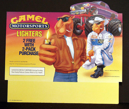 "Camel Motorsports Lighters - 2 free with 2-pack purchase" 2 Joe Camels - one with lighter, the other dressed as monster truck driver. Monster truck in background.