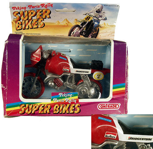 Red toy motorcycle. Fake logos include Marlboro, Bridgestone.