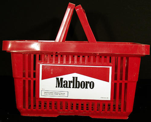 Grocery basket with 2 grand uion ads and 2 Marlboro logos.