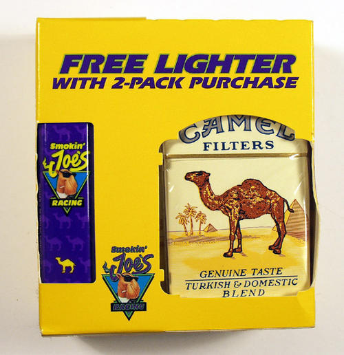 Free lighter with 2 pack purchase. Purple "Smokin' Joe's Racing lighter. Yellow box.Joe Camel