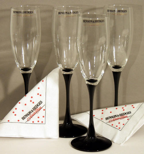 Benson & Hedges signature collection: set of wine glasses (4) with tinted black base and clear glass. Benson and Hedges written in gold around glass rim.