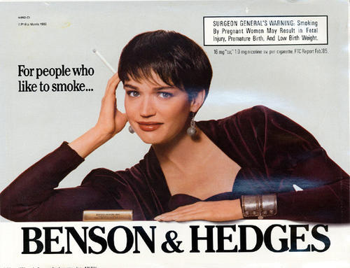 For people who like to smoke... Benson & Hedges sign. Woman shown holding cigarette with pack before her. Black text along sign bottom.