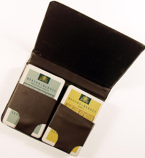 Brown basket containing two decks of cards; one green deck for Benson & Hedges Menthol 100s; another yellow deck for Benson & Hedges 100s; Both designed to appear as cigarette packs.