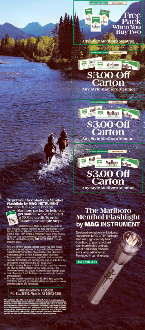 Direct mail from Marlboro in promotion of Marlboro's menthol blend. Features image of cowboys riding horses in shallow water. Fifty free Marlboro Miles and four cigarette coupons included. Order form for a Marlboro flashlight also included.