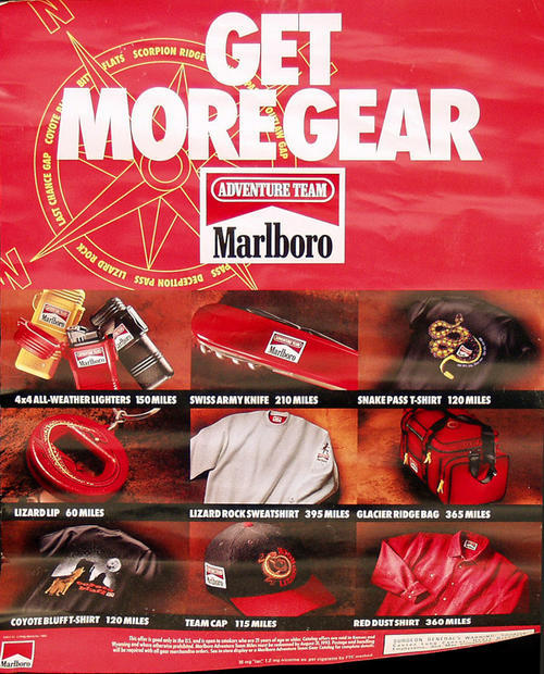 Marlboro "Get the Miles. Get the Gear." Poster with ATV rider pictured riding through snow at top, and pictures of Marlboro outdoor gear at bottom.