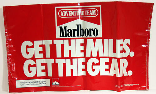 Small vinyl sign. Red. "Adventure Team Marlboro" "Get the Miles. Get the Gear". Double sided.