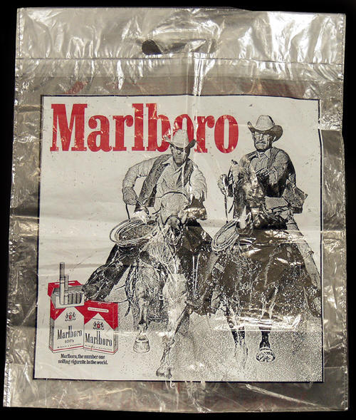 Vienna International Airport. Duty Free Shop shopping bag with Marlboro and on back. Ad features 2 cowboys, 2 packs and "Marlboro, the number one selling cigarette: in the world"