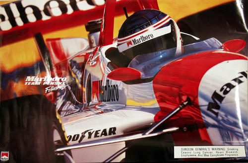 Marlboro/Penske Team racing poster. "Follow us" slogan. Pictured is driver in car, apparently during race.