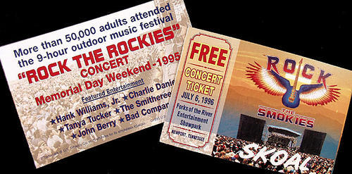 Rock The Smokies Skoal free concert ticket July 6, 1996 in Newport, Tennessee. "Rock the Rockies" concert.