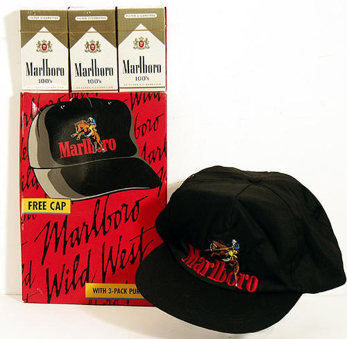 Free cap with 3 pack purchase. Black Cap with Cowboy on horse and "Marlboro". Marlboro 100s Packs.