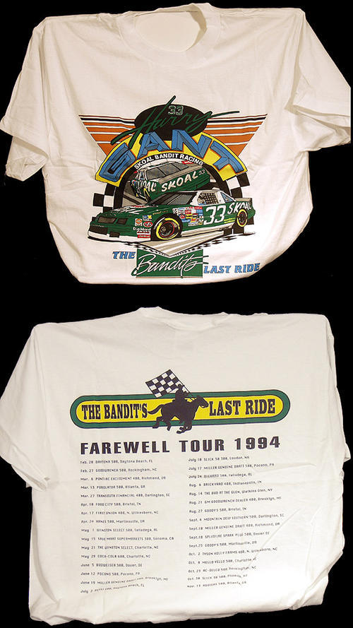 White T-shirt, "Harry Gant Skoal Bandit Racing .. The Bandit's Last Ride" with Skoal racing car image.