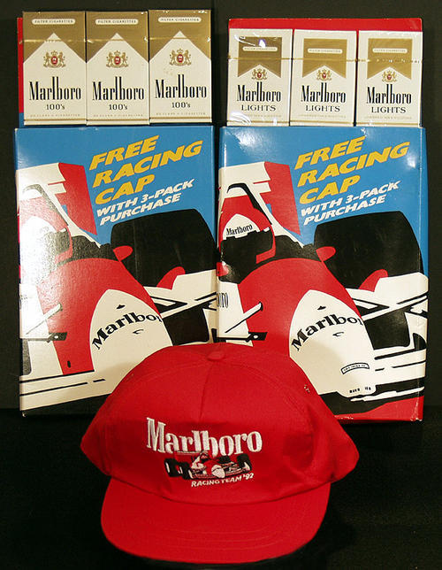Free racing cap with 3 pack purchase of Marlboro 100s. Cardboard box has illustration of Marlboro race car and driver.