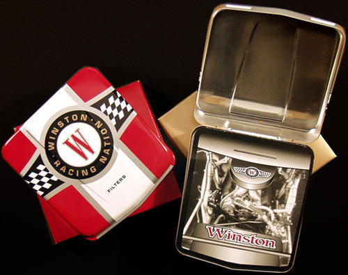 Mock hood of a car tin with "Winston Racing nation" logo. Gold case, 20 light cigarettes.