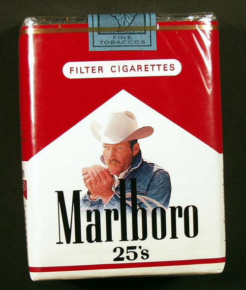 Pack of Marlboro 25s with illustration of cowboy lighting cigarette.