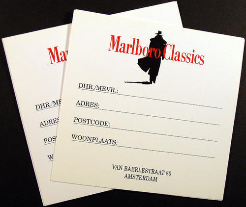 Mailing list for "Marlboro Classics" in Amsterdam. White with shadow Marlboro man figure. Form included to be added to the mailing list.