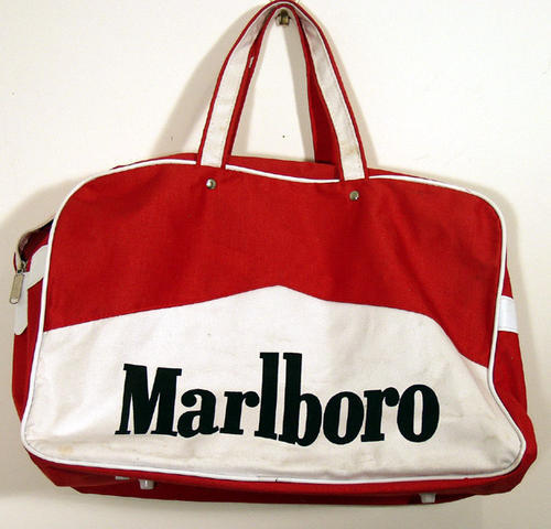 Red and white Marlboro travel bag. Marlboro text in black on both sides; two red straps and one white zipper on bag.