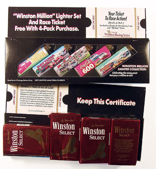 3 sets of 4 packs of Winston and 5 free lighters with free ticket to participating tracks and dates. Note enclosed in packaging. Two of three sets are lights, one is Winston select.
