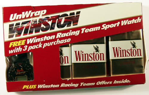 Free Winston Racing wristwatch with the purchsae of 3 lights boxes. Other racing team merchandise enclosed inside. "Unwrap Winston."