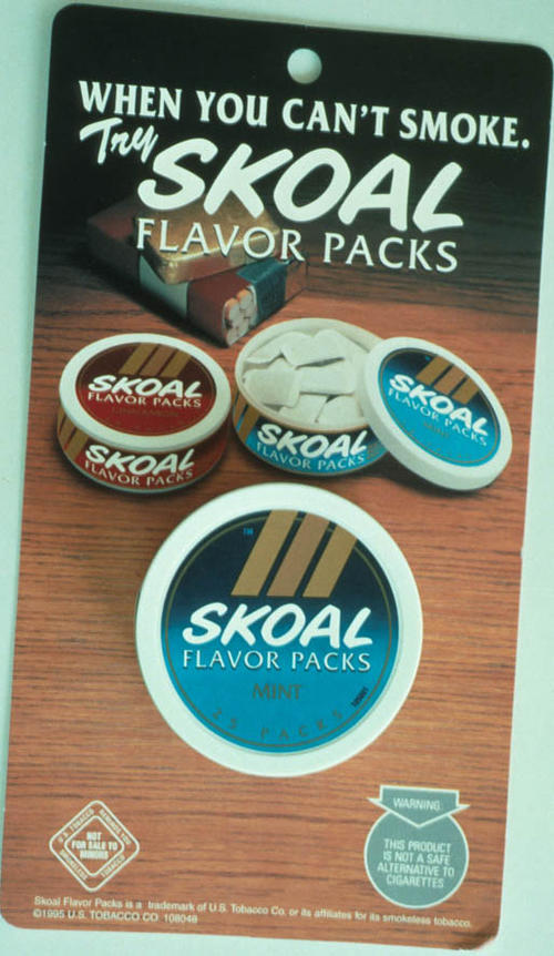 Skoal flavor packs. Tobacco sachets in white boxes, somewhat more feminine than packaging for other brands in this family. Advertising pitches this as an alternative to smoking.
