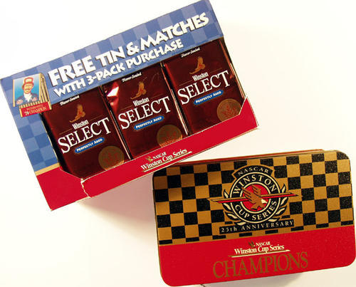 Free Nascar 25th Anniversary commemorative tin and 50 matchboxes with purchase of 3-pack Winston SELECT. NASCAR Winston Cup Series. Brand loyalty catalog included.