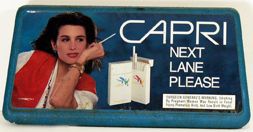 Blue Capri "Next Lane Please" display with woman shown holding a cigarette.