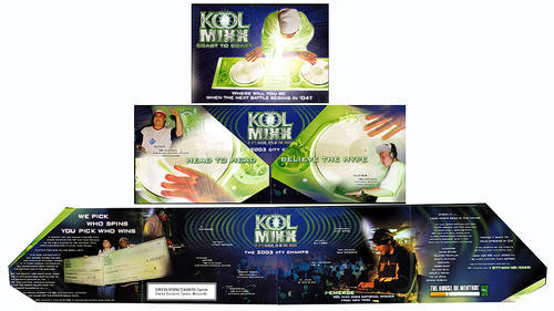 Promotion for KOOL MIXX DJ competition: "Head to head, believe the hype." KOOL MIXX coast to coast dj contest direct mail."KOOL MIXX: If it's music, it's in the mixx". The 11 city dj champions were invited to national contest in Chicago for the "Ultimate Spin-off". A number is given to find out about KOOL MIXX 2004. Celebrity artists are named as having been "in the hype". other key words: music, entertainment, events