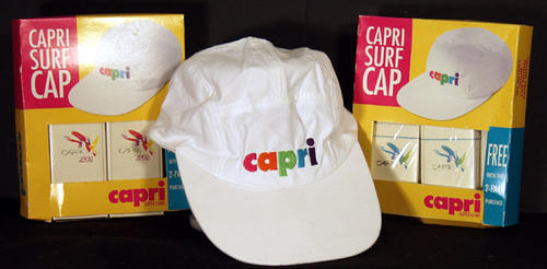 Yellow box, free Capri hat with 2 pack purchase \"Capri surf hat\".