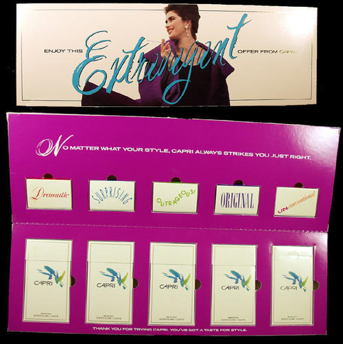 Woman smoking on cover of sample cartoon of 5 packs super slim lights with matchbooks. "Enjoy this extravagent offer from Capri."