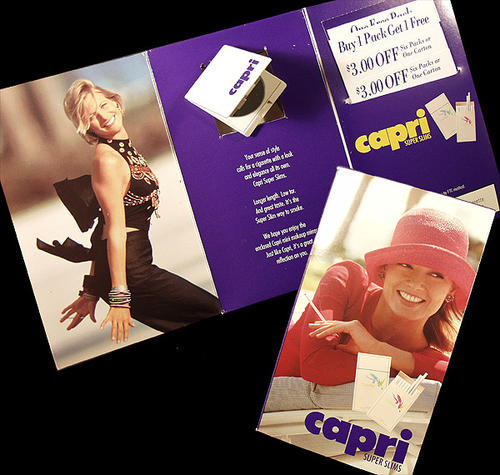 Capri super slim mailing with mini makeup mirror and buy 1 pack get 1 free coupons enclosed. Woman pictured prominently with cigarettes in mailing.