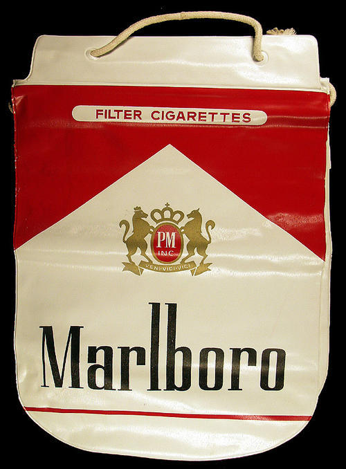 Inflatable red and white Marlboro display with nylon string at top for hanging. Display is in the shape of a cigarette pack, Marlboro text is in black.